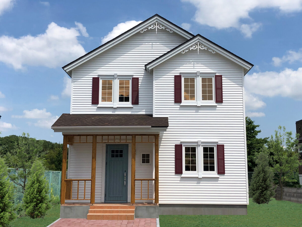 外観は、セルコホームが得意とするアーリーアメリカンスタイル。三角屋根に横張りのラップサイディングとカバードポーチと、北米住宅のセオリーをしっかり踏襲しています。格子窓の両脇につけられた鎧戸やジンジャーブレッド(屋根の妻飾りの一種)が華を添え、近隣の住宅とは一味違った家に仕上がっています。